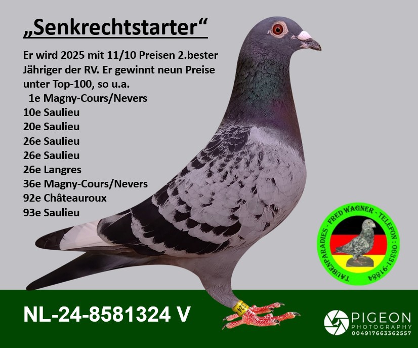 Unser "Löwenherz" unterstreicht einmal mehr seine Vererberqualitäten; zwei Kinder aus seinen Söhnen belegen beim Derby Halkidiki in Griechenland im Finale mit 505 km den 21e und 30e Platz, sowie im Semi-Finale den 38e Platz.